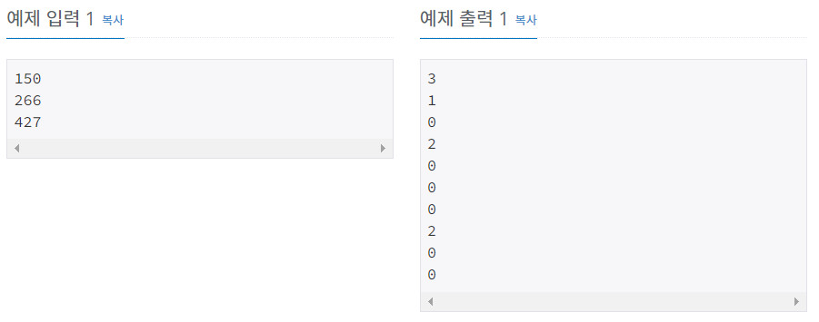 예를 들어 A = 150, B = 266, C = 427 이라면 A × B × C = 150 × 266 × 427 = 17037300 이 되고, 계산한 결과 17037300 에는 0이 3번, 1이 1번, 3이 2번, 7이 2번 쓰였다.